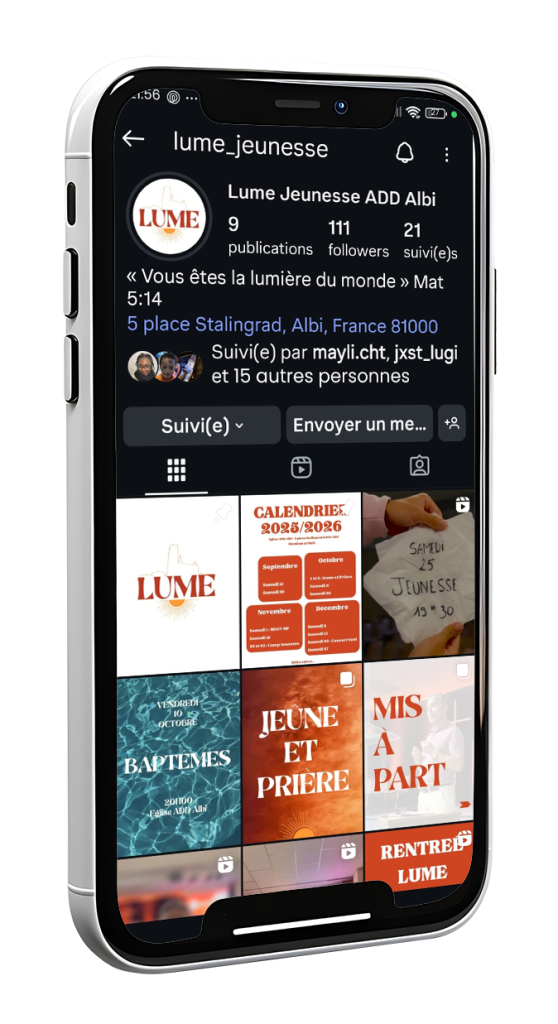 Les jeunes partagent de nombreux moments ensemble : sorties, temps de louange, soirées de discussion, activités conviviales et rencontres à thèmes. Ces temps forts leur permettent de tisser des liens profonds, de s’encourager mutuellement et de découvrir une véritable communauté de frères et sœurs en Christ. Lume Jeunesse est un groupe dynamique, vivant, où la joie, la sincérité et l’entraide occupent une place centrale. Ensemble, ils apprennent à marcher dans la foi, à s’épanouir et à grandir dans leur relation avec Dieu.